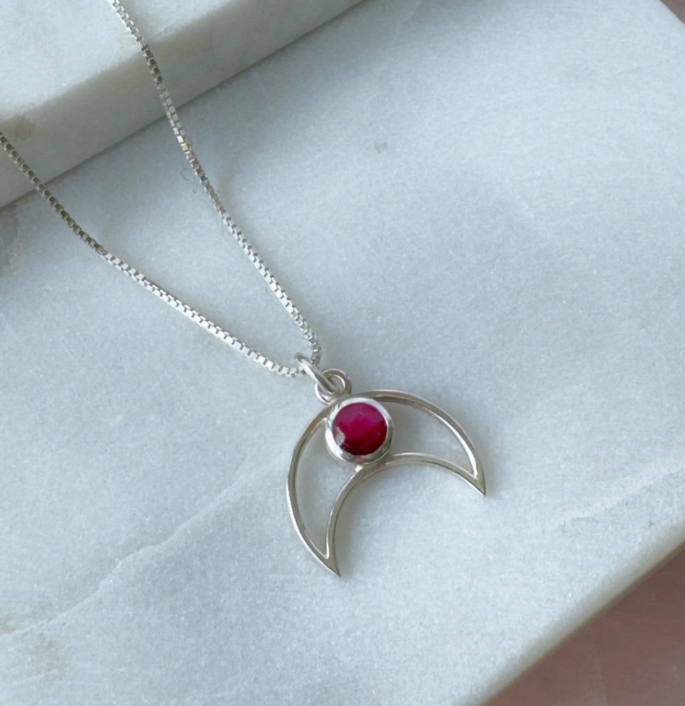 This crescent moon necklace holds a vibrant ruby — a stone of passion, courage, and love. It reminds you to follow your inner fire, even when the world feels dark. The moon cradles the gem like a guardian of dreams, balancing soft intuition with fierce strength.